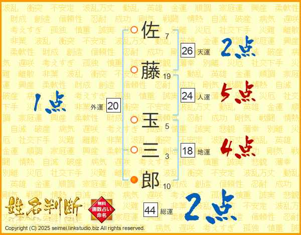 佐藤玉三郎さんの総運は44画の2点!