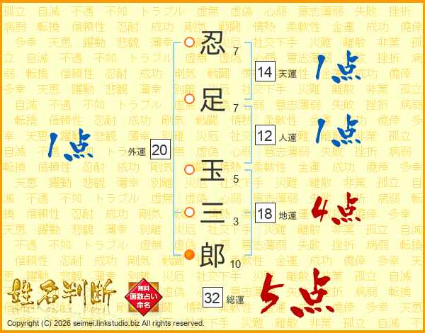 忍(7画)足(7画) 玉(5画)三(3画)郎(10画)