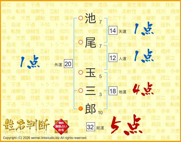 池(7画)尾(7画) 玉(5画)三(3画)郎(10画)