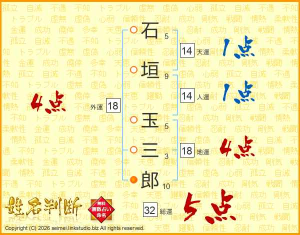 石(5画)垣(9画) 玉(5画)三(3画)郎(10画)
