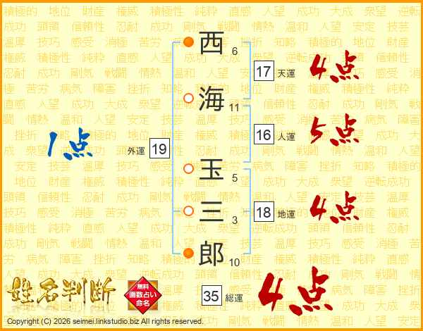 西(6画)海(11画) 玉(5画)三(3画)郎(10画)