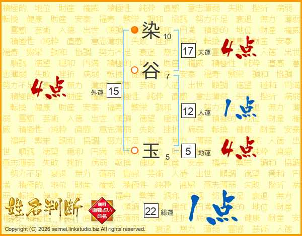 あなたの人生を表す1番重要な運勢です。生涯を通じて影響する総合運となり、主に50歳以降の晩年期に影響を及ぼします。苗字と名前の合計画数。