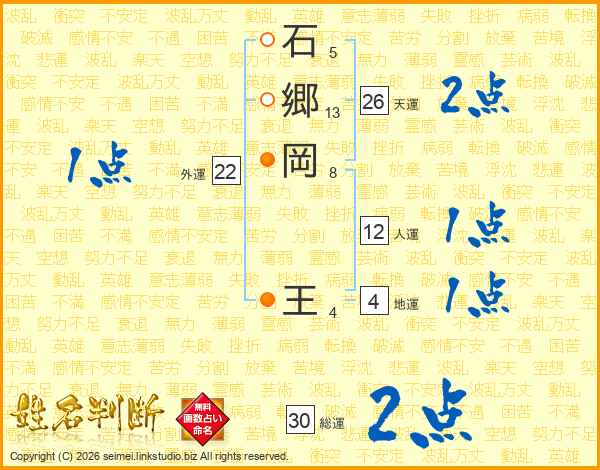 石郷岡王さんの天運は26画の2点!