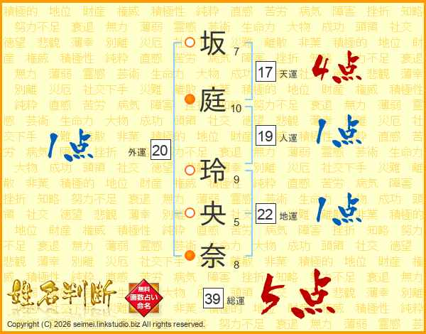 坂(7画)庭(10画) 玲(9画)央(5画)奈(8画)