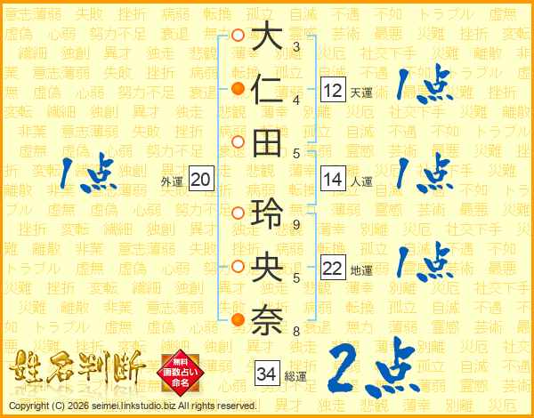 大仁田玲央奈さんの総運は34画の2点!