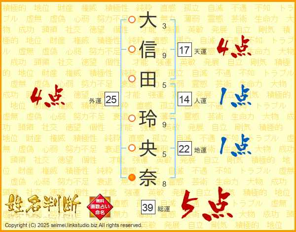 大信田玲央奈さんの総運は39画の5点!