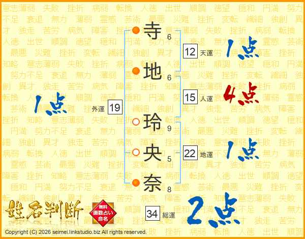 寺(6画)地(6画) 玲(9画)央(5画)奈(8画)