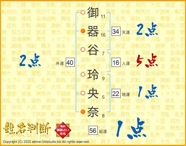 御(11画)器(16画)谷(7画) 玲(9画)央(5画)奈(8画)