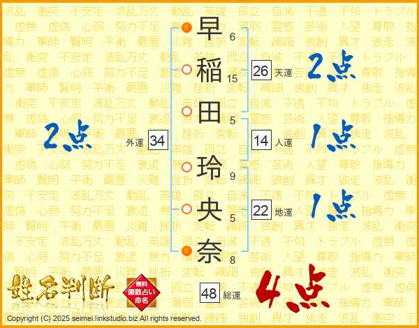 早稲田玲央奈さんの総運は48画の4点!
