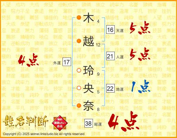木(4画)越(12画) 玲(9画)央(5画)奈(8画)