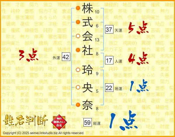 株(10画)式(6画)会(13画)社(8画) 玲(9画)央(5画)奈(8画)