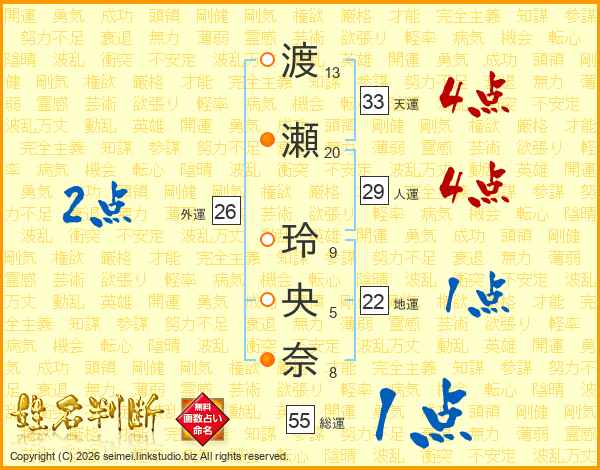 渡瀬玲央奈さんの総運は55画の1点!