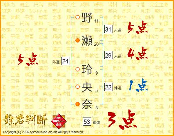野(11画)瀬(20画) 玲(9画)央(5画)奈(8画)