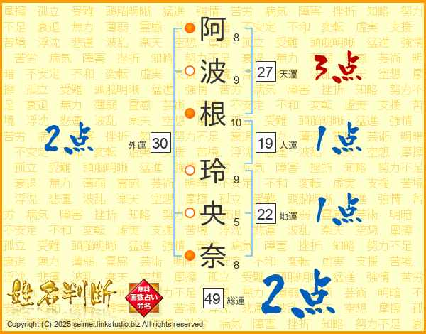 阿(8画)波(9画)根(10画) 玲(9画)央(5画)奈(8画)