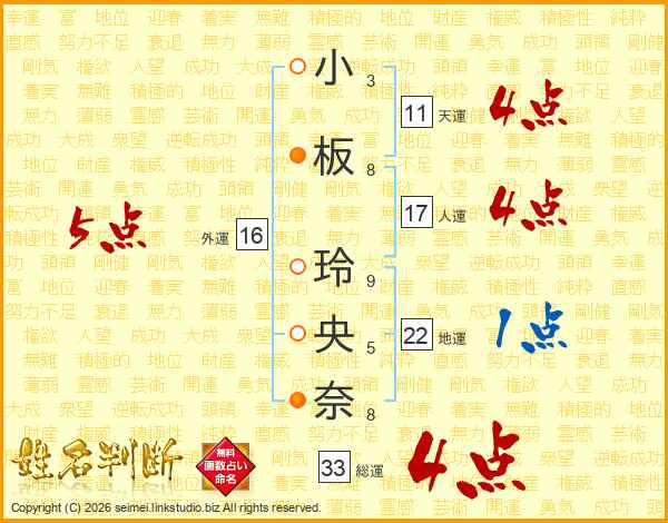 小(3画)板(8画) 玲(9画)央(5画)奈(8画)