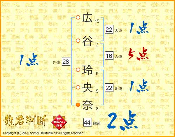 広(15画)谷(7画) 玲(9画)央(5画)奈(8画)