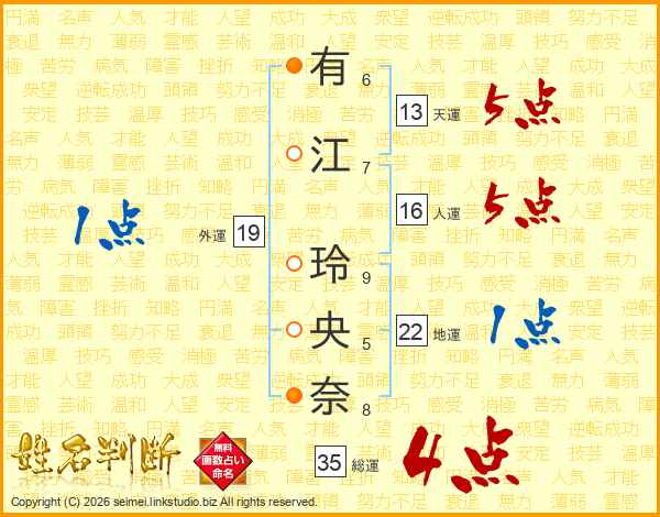 有(6画)江(7画) 玲(9画)央(5画)奈(8画)