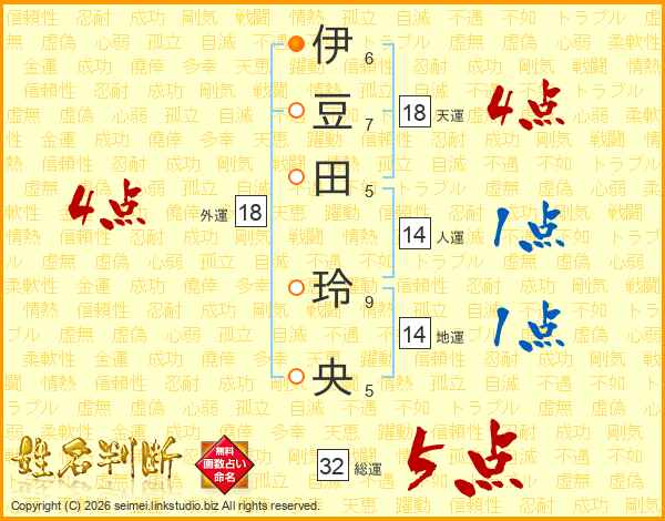 伊(6画)豆(7画)田(5画) 玲(9画)央(5画)