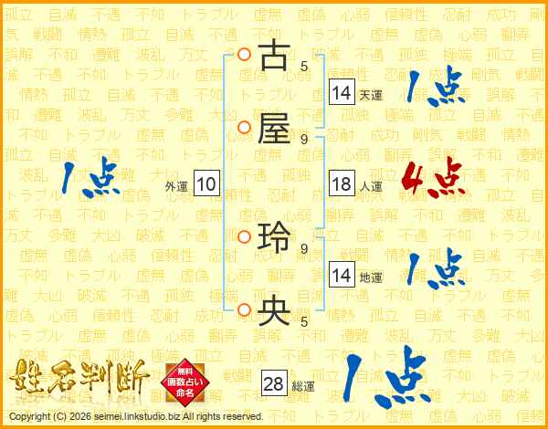 古(5画)屋(9画) 玲(9画)央(5画)