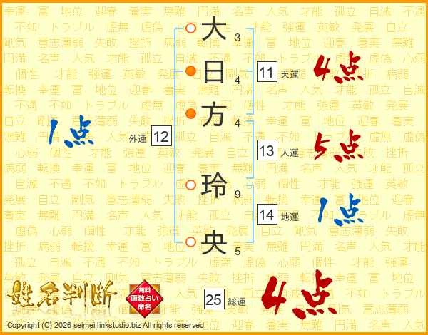 大(3画)日(4画)方(4画) 玲(9画)央(5画)