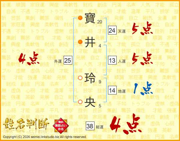 寶(20画)井(4画) 玲(9画)央(5画)