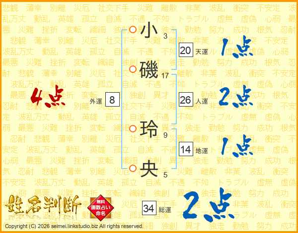 小(3画)磯(17画) 玲(9画)央(5画)