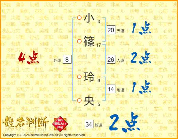 生活面を象徴する運勢です。外部から受ける影響力を表し、結婚運、家庭運や職場、環境への順応性を表します。総運から人運を引いた画数。姓や名が1文字の場合を除く。
