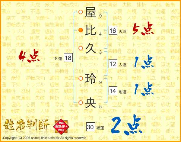 屋(9画)比(4画)久(3画) 玲(9画)央(5画)
