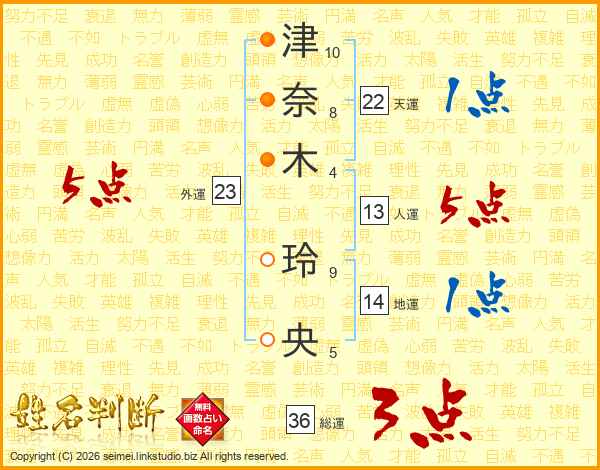 津(10画)奈(8画)木(4画) 玲(9画)央(5画)