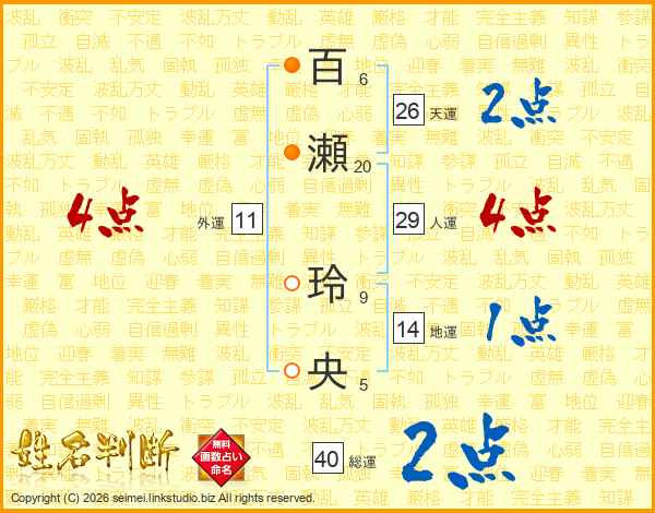 百(6画)瀬(20画) 玲(9画)央(5画)