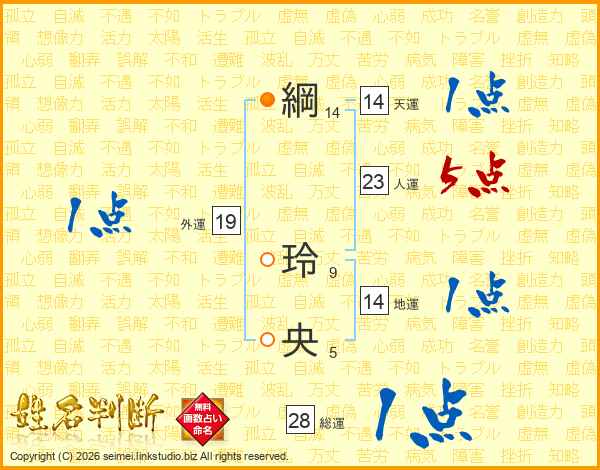 綱(14画) 玲(9画)央(5画)