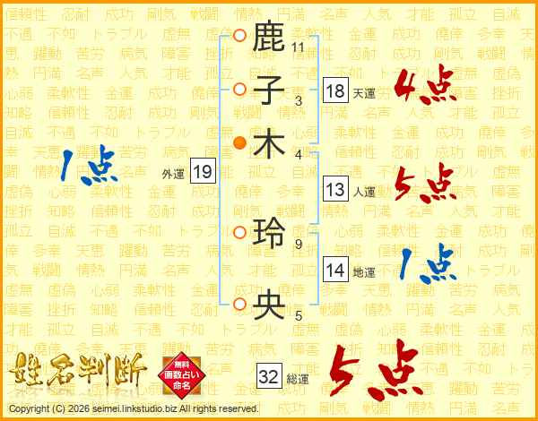鹿(11画)子(3画)木(4画) 玲(9画)央(5画)