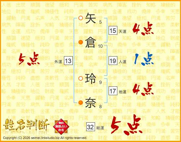 矢(5画)倉(10画) 玲(9画)奈(8画)