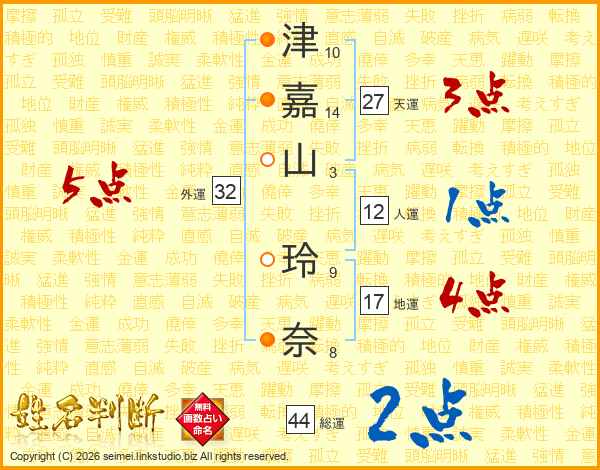 津(10画)嘉(14画)山(3画) 玲(9画)奈(8画)