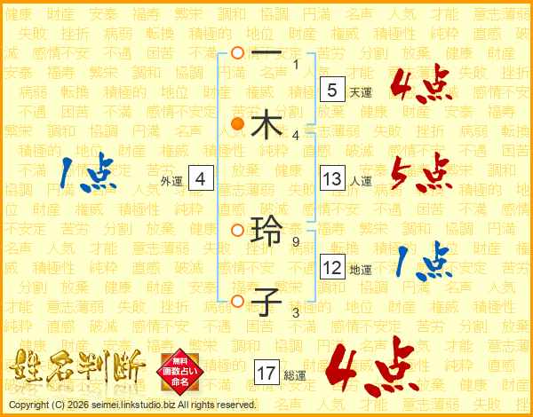 生活面を象徴する運勢です。外部から受ける影響力を表し、結婚運、家庭運や職場、環境への順応性を表します。総運から人運を引いた画数。姓や名が1文字の場合を除く。