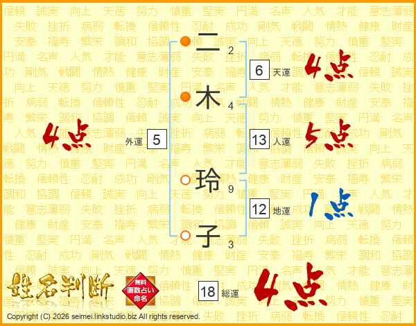 生活面を象徴する運勢です。外部から受ける影響力を表し、結婚運、家庭運や職場、環境への順応性を表します。総運から人運を引いた画数。姓や名が1文字の場合を除く。