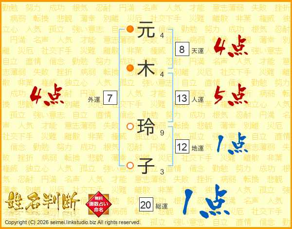 元(4画)木(4画) 玲(9画)子(3画)