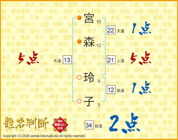 生活面を象徴する運勢です。外部から受ける影響力を表し、結婚運、家庭運や職場、環境への順応性を表します。総運から人運を引いた画数。姓や名が1文字の場合を除く。