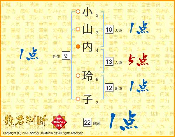 小(3画)山(3画)内(4画) 玲(9画)子(3画)