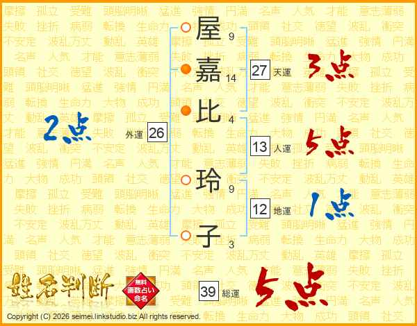屋(9画)嘉(14画)比(4画) 玲(9画)子(3画)