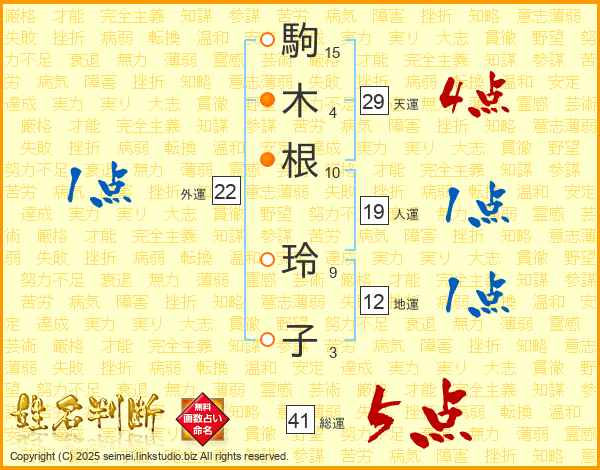 駒(15画)木(4画)根(10画) 玲(9画)子(3画)