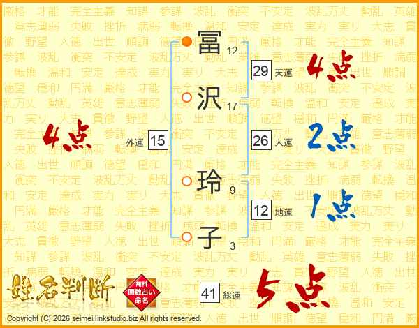 冨(12画)沢(17画) 玲(9画)子(3画)