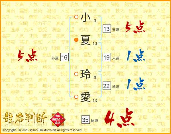 小(3画)夏(10画) 玲(9画)愛(13画)