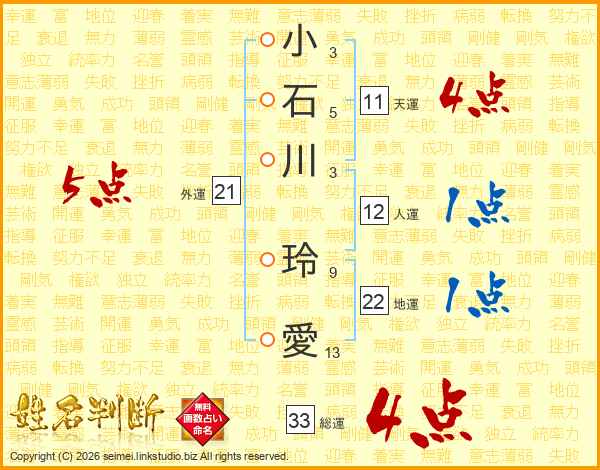 小(3画)石(5画)川(3画) 玲(9画)愛(13画)