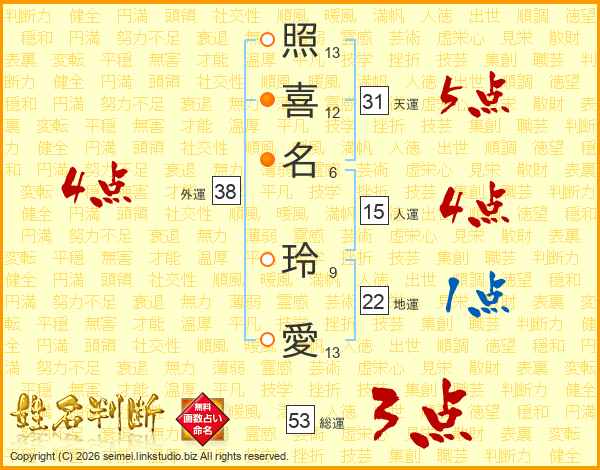 照(13画)喜(12画)名(6画) 玲(9画)愛(13画)