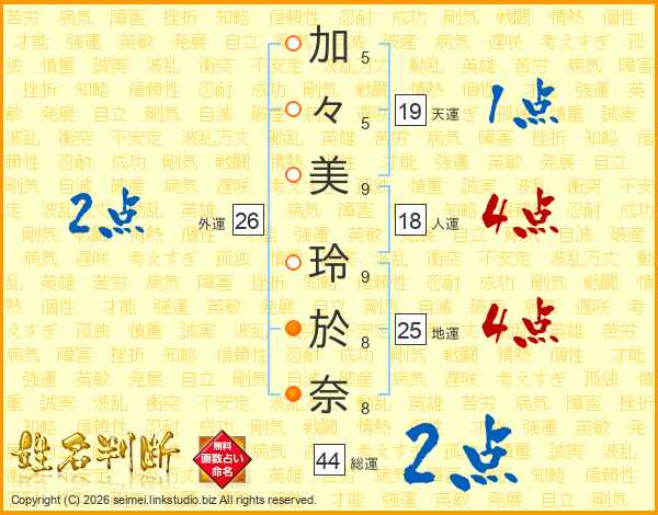 加(5画)々(5画)美(9画) 玲(9画)於(8画)奈(8画)