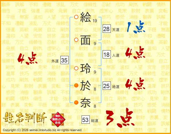 絵(19画)面(9画) 玲(9画)於(8画)奈(8画)