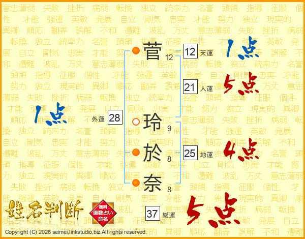 菅(12画) 玲(9画)於(8画)奈(8画)