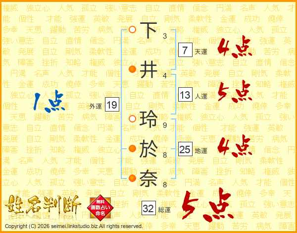 下(3画)井(4画) 玲(9画)於(8画)奈(8画)