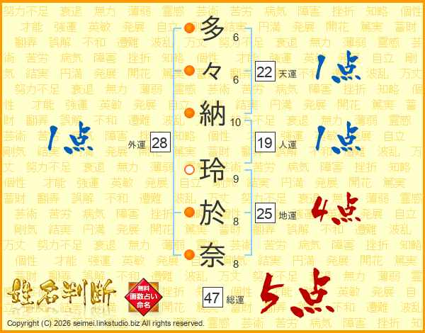 多々納玲於奈さんの総運は47画の5点!